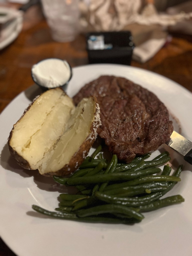 There’s a common theme for us when we get steaks out. I get the ribeye, she gets the filet mignon. This is definitely one of my favorite ribeyes I’ve had. This time I went with the green beans and baked potato. Hard to go wrong with a baked potato!