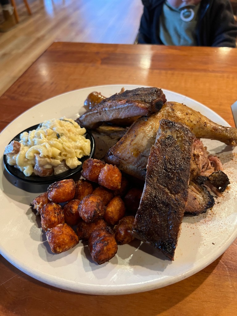 To try them all, I had to go with the Haze smokehouse platter, covered with BBQ ribs, brisket, pulled pork, chicken, and “sassy sausage.” For sides, I got the sweet potato tots and ham & poblano mac n cheese. It was all incredible and the prices are reasonable for the amount of food you get.