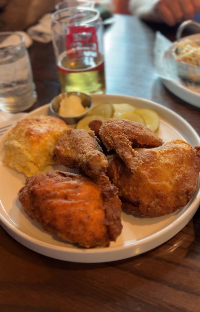 We started off with baked oysters which were tremendous. I got the half fried chicken meal with fries. My mom got shrimp and cheddar grits, Rachel ordered chicken tender lettuce cups and Bennett got a chicken tender meal. Below the restaurant is a super cool theatre and library with spooky vibes if you’re looking for a Halloween getaway. The servers were very welcoming and the service was fairly quick. Just be prepared to pay $10 to park on The Stanley property! You get a special Stanley coin which you can use on property to help pay for drinks. I kept mine as a souvenir.