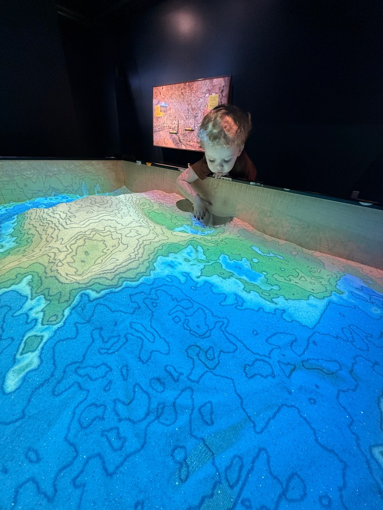 I can give credit to the Arizona Science Center for making Bennett fall in love with sand pits. Theirs is quite large compared to a few others I’ve seen, and it allows kids to run their hands through the sand while the land or sea moves with them. We have since purchased a sand kit to have at home with us.