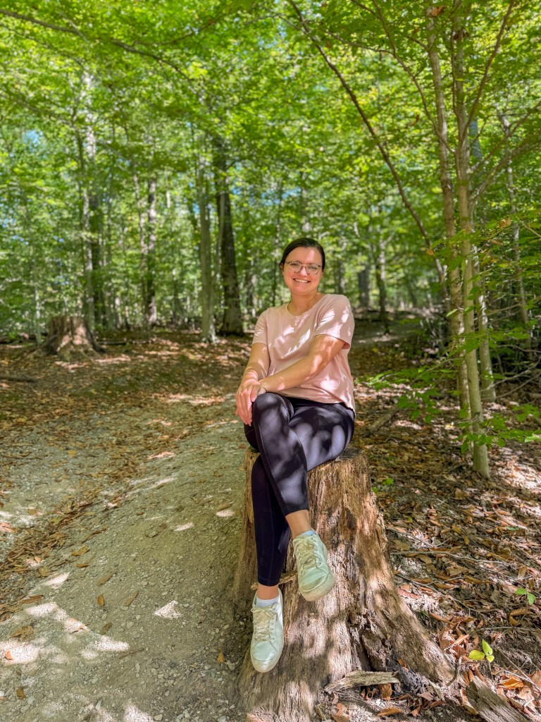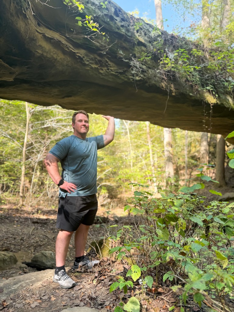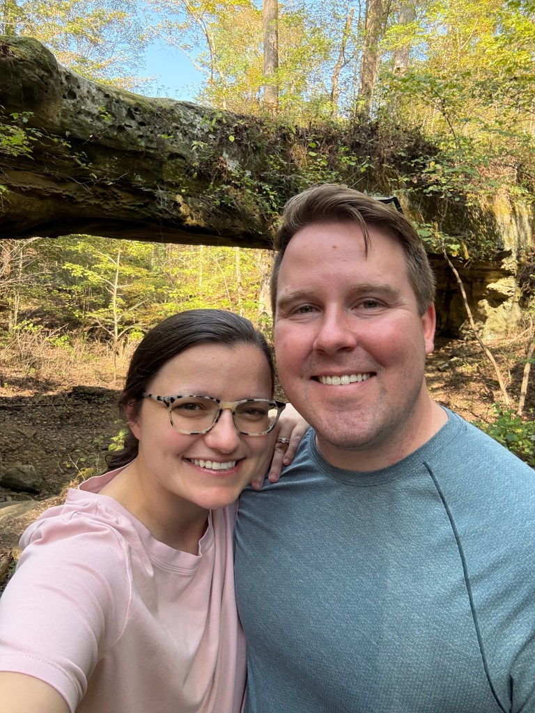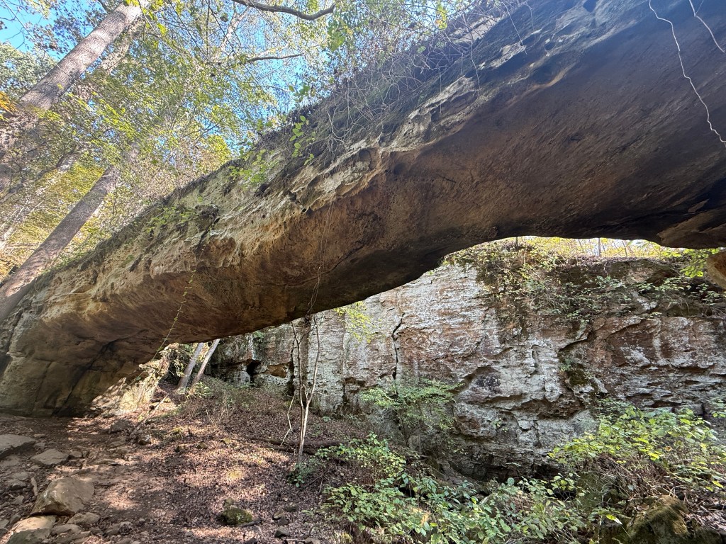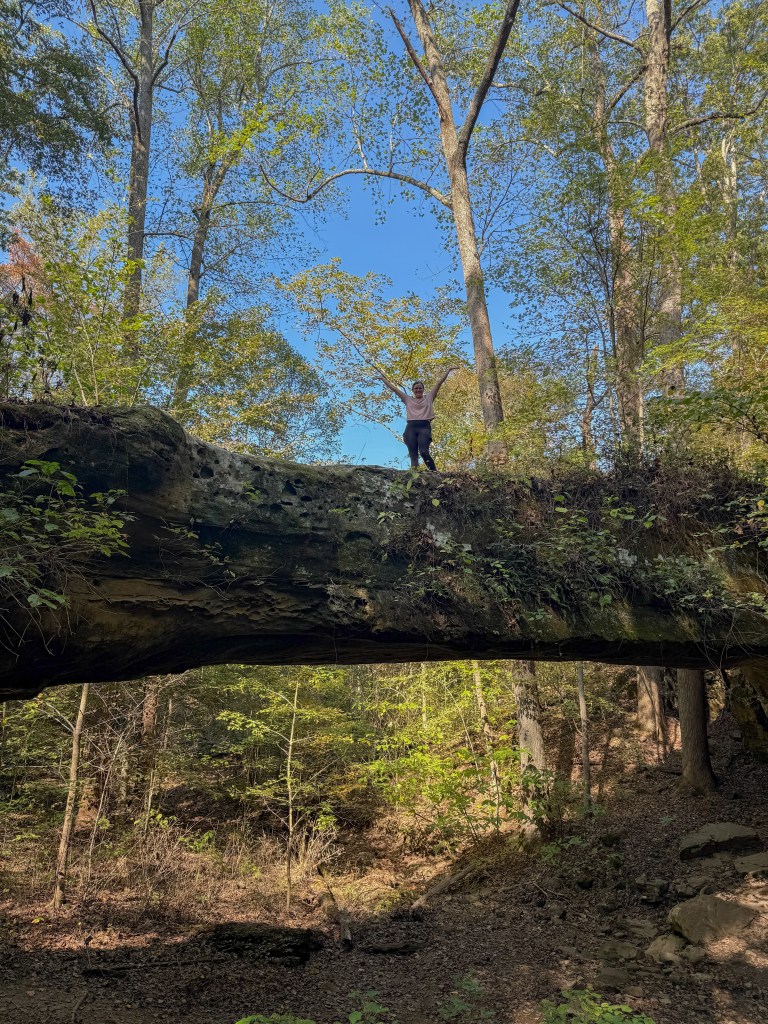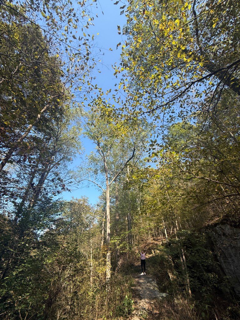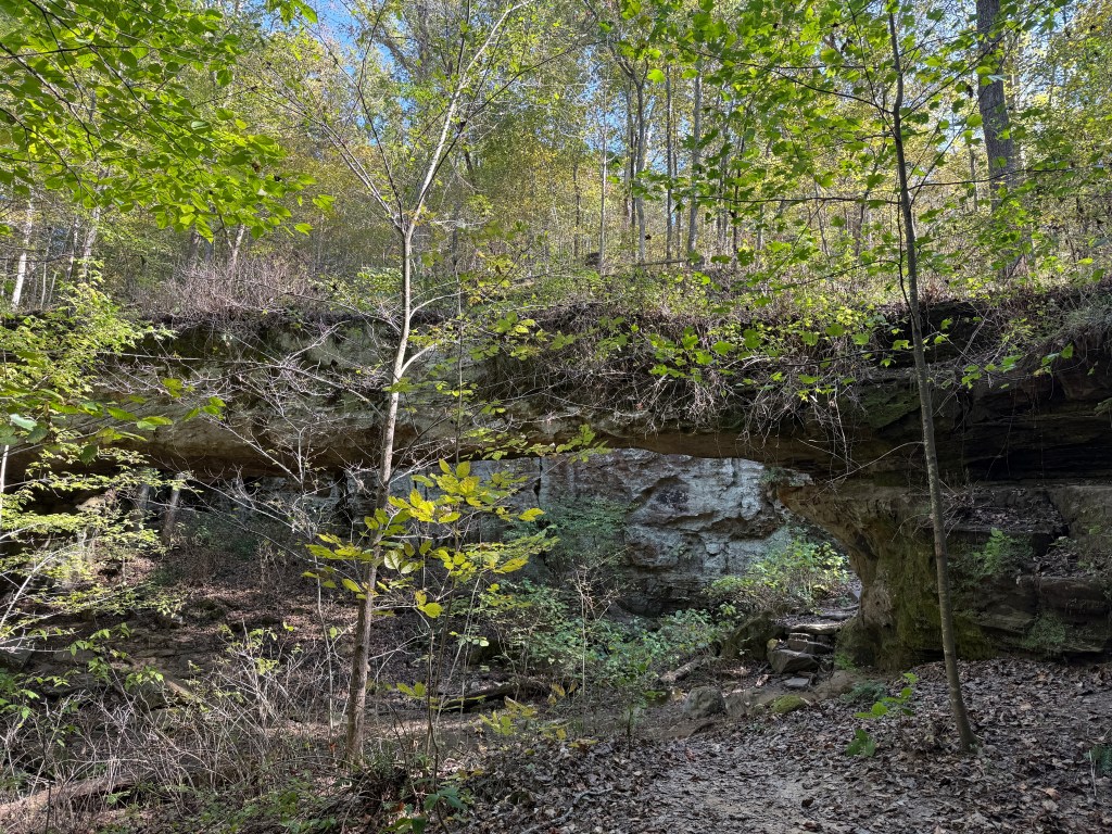 Southern Illinois isn’t just known for its wine. It’s also known for its scenic hikes and breathtaking views. I wouldn’t say the Pomona Natural Bridge Trail has any “breathtaking” views, but the easy quarter-mile hike is an enjoyable one. The Natural Bridge is just that! A rocky bridge you can walk over in between two sets of bluffs in the middle of the woods. We had a beautiful day for our hike. Not a cloud to be seen and bright, radiant blue skies. The leaves were just starting to fall, too.