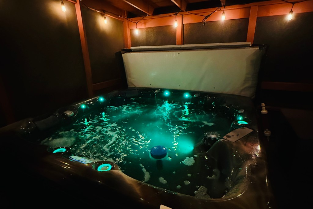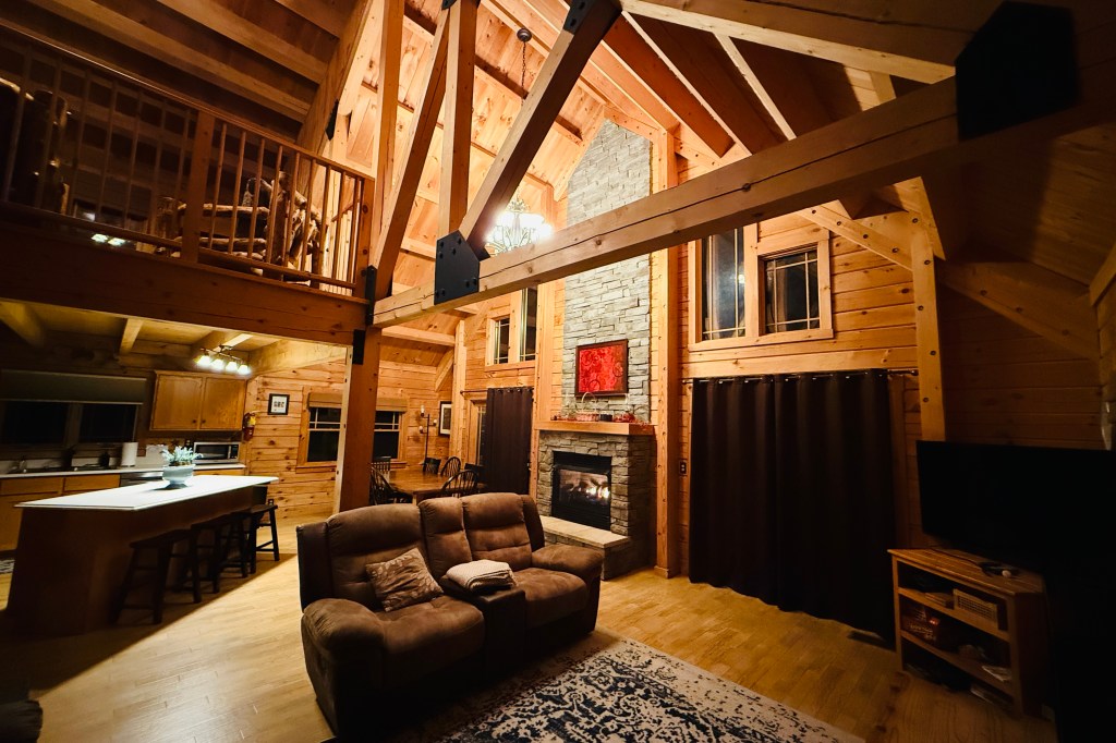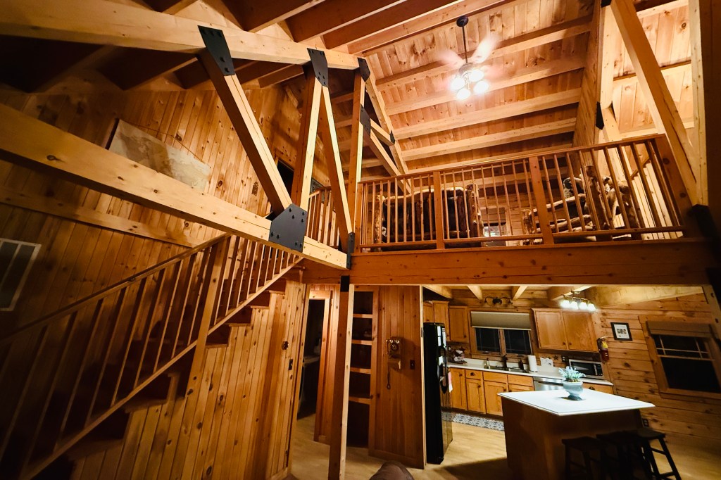 This Carbondale cabin makes you feel like you’re in Colorado. With three bedrooms (plus additional sleeping space) and two bathrooms, Premier Cabin can sleep up to 8 people. It’s a scenic, secluded cabin perfect for family reunions or a friends getaway. Highlights include a wraparound porch, outdoor fire pit with seating, and of course… the indoor hot tub! Vaulted ceilings and a beautiful fireplace hold the cabin together, while the upstairs loft brings me back to my childhood, when my family and I visited Yellowstone. It’s a very spacious cabin, with wonderful amenities.