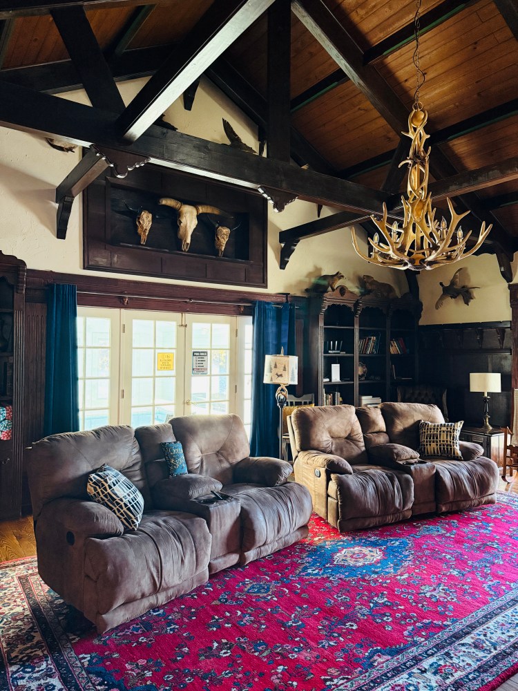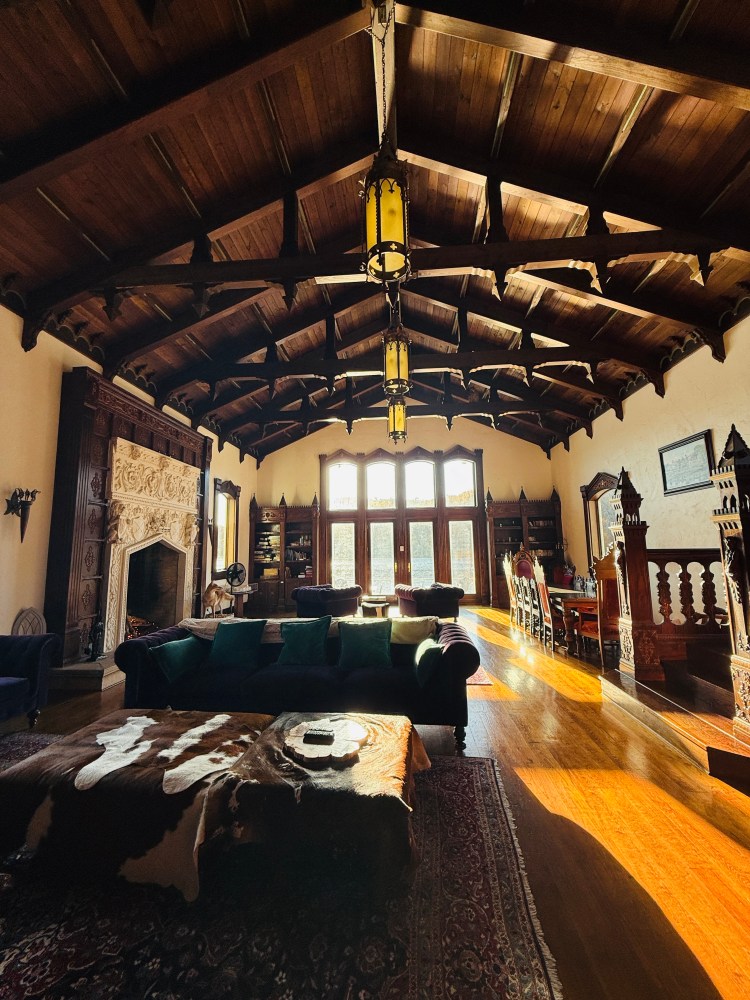 The castle was originally more of a lodge for the owner, and the owners kept building on to it. The photo above and beneath are both in that main lodge room I was talking about. Comfy couches are available with a big TV on top of a beautiful fireplace.